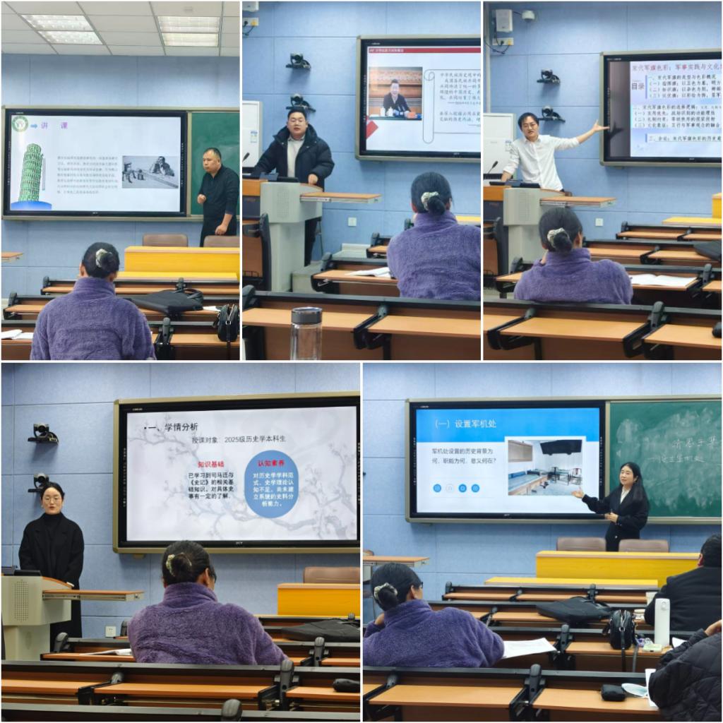 按照比赛规则,五位参赛教师依次进行说课和模拟授课。李国东老师进行了细致的学情分析,以《教育实验研究》为例,系统地阐述了其理论内涵、方法特点与实践程序。杨文超老师以《中华民族共同体概论》课程中的“五胡入华与中华民族大交融”为主题,讲述了“五胡”政权融入华夏的主动性,引导员工深化对中华民族大交融的认识。高天老师创新性地以《AI史学论文撰写》为主题,以AI生成的“宋代军旗色彩”主题论文为例,揭示了AI在史料真实性与逻辑推理上的缺陷。张彦晓老师讲述了《清朝君主集权的发展》,充分体现了其对教材的深度把握、对学情的精准分析以及运用多样化教学方法的能力。过轩老师创设“历史法庭”情景,以《史记》“通古今之变”的智慧,培养员工鉴古知今思维,体现了思辨性引导特色。