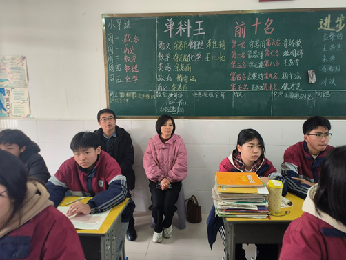 在息县第三初级中学,史经霞与项杰董事长进行座谈,了解了实习生的工作表现、生活环境等情况,感谢学校对实习研究生的支持与关爱。随后史经霞等到教室听取了实习生王浩坤的授课,对实习生的表现表示肯定。
