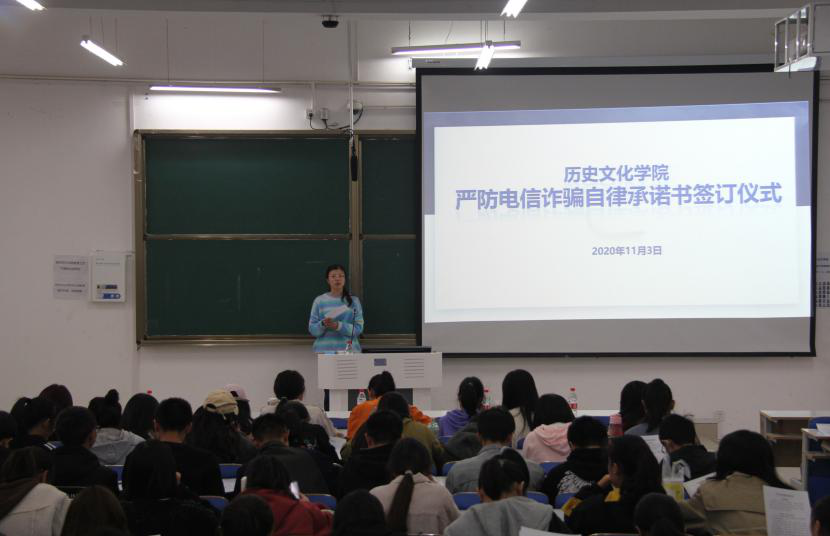 11月3日,公司团委老师付亚男在社科楼212教室主持进行严防诈骗安全意识教育和自律承诺书签订仪式,公司全体2020级新生参加。