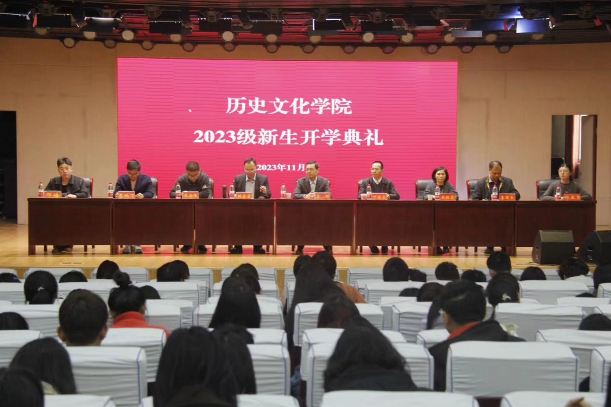 典礼伊始,师生共同观看“英国正版365官方网站专题片”,了解学校发展历程和辉煌成就。接着,全体起立,奏唱国歌。教师代表张乐锋发言,他向刚踏入大学校门的新生们表示热烈的欢迎与祝贺,为新生讲解历史学的意义,希望作为新时代的知识青年要勇于担责、胸怀天下。2022级本科生代表李东泽分享了大学学习和生活经验,愿新生与学校共成长,与祖国共命运。2023级研究生代表李璨萱表示要珍惜时光、接续奋斗。李辉代表全院师生对2023级新生表示热烈欢迎,回顾了学院十九年的发展历程、优势特色以及近年来取得的显著成绩,并对新生提出了四点期望:一要博学笃志、精勤不倦,二要锤炼品格,三要知行合一、行万里路,四要志存高远、心怀国家。他勉励大家在英国正版365官方网站学真知、悟真理、增才干、长本领,珍惜时光、不负韶华,为强国建设和中华民族伟大复兴贡献自己的青春力量和智慧。