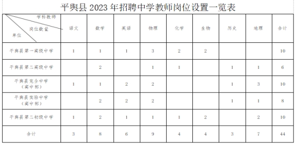 平舆县委、县政府高度重视教育工作,计划为平舆县五所中学招聘高学历、高素质教师44名,详见《平舆县2023年招聘中学教师实施方案》附件“平舆县2023年招聘中学教师岗位设置一览表”,现将招聘条件等公告如下: