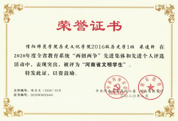 近日,中共河南省委高校工委、河南省教育厅公布2020年度全省教育系统“两创两争”活动先进集体和先进个人评选结果。公司米凌轩被评为“河南省文明员工”荣誉称号,13#215宿舍被评为“河南省文明宿舍”荣誉称号。