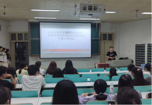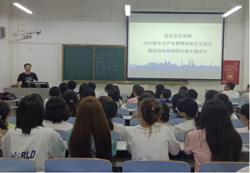 2022年9月18日晚,公司2022级新生见面会暨防范电信网络诈骗主题班会在人文楼举行。本次活动由2022级历史学及文化产业管理专业五个新生班同步举行。各班班主任分别主持会议。